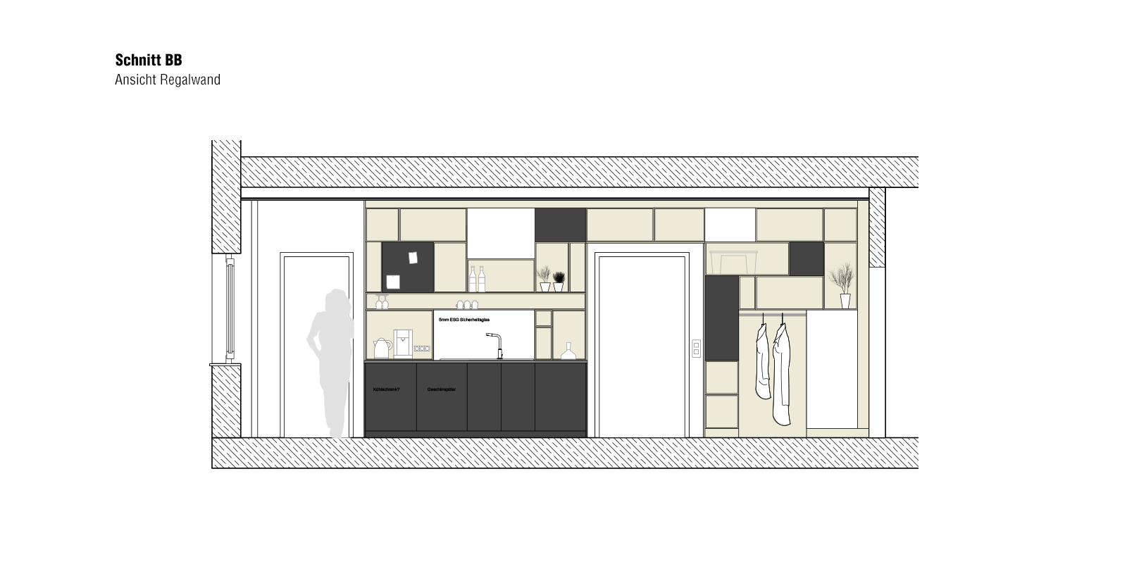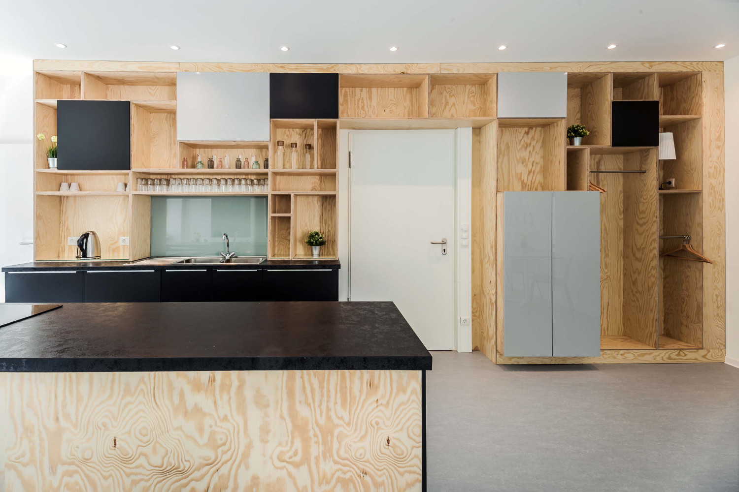 Das Hauptelement ist ein wandgreifendes Regal, welches wie aus unterschiedlich großen Kisten aufeinander gestapelt zu sein scheint. Einige der Fächer bekommen Fronten um auch Kleinkram zu bändigen. Ebenfalls in das Regal integriert ist eine Küchenzeile, welche sich im gegenüberliegenden Tresen fortsetzt. Die Materialanmutung vereint rustikales in Form von Seekieferplatten, sowie edlere Komponenten in Form von matten, anthrazitfarbenen und weißen Fronten. Ergänzt werden diese durch den durchgängig verlegten grauen Linoleumboden, weißen Tischen und hellblauen Sitzmöbeln, welche Bezug nehmen auf die CI-Farben der bip gGmbH. Als Highlight kommt eine Wandgestaltung in Form von, eigens für diesen Ort gezeichneten, Illustrationen. Das Materialkonzept wird in den angrenzenden Räumen fortgesetzt. Ergänzend dazu wurde ein Lichtkonzept entwickelt, welches gleichzeitig Gestaltungsmittel für die Decke ist, die Räume auflockert und durch seine Materialität und Anordnung der Akustik zuträglich ist: es besteht aus einer Vielzahl unterschiedlicher Leuchtenschirme in verschiedenen Größen, welche in bestimmten Deckenbereichen abgehängt werden. So zum Beispiel im Flur oder über dem Gastraum im Café, wo durch die Möbelanordnung und/oder Raumbeschaffenheit außer an der Decke wenig Raum für Gestaltung bleibt. So wird mit einfachen Mitteln Gemütlichkeit und Atmosphäre kreiert.